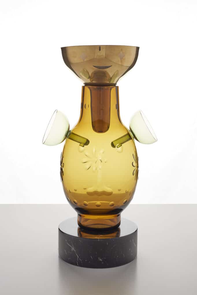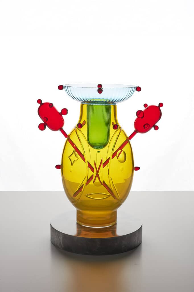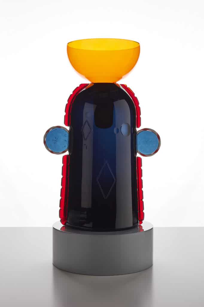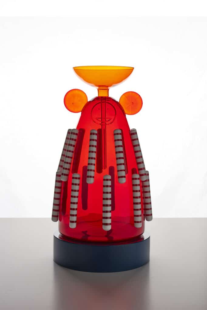 Crafted on the island of Murano, each vessel showcases masterful technique: blown into molds, shaped with molten glass additions, and finished with detailed etching. But what sets Afrikando apart is its poetic sense of balance—the components are not fused but instead rest delicately upon one another, creating an impression of lightness and impermanence. Funnels hover, red staffs perch, and layers of glass filter light in unexpected ways. The result is not just a series of objects, but an expressive narrative in glass—where each piece speaks of cultural dialogue, migration of forms, and the transformative power of global influence. Afrikando is, at once, a celebration and a meditation: on tradition, hybridity, and the possibility of finding harmony in contrast.