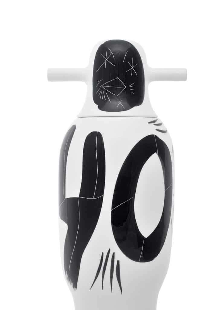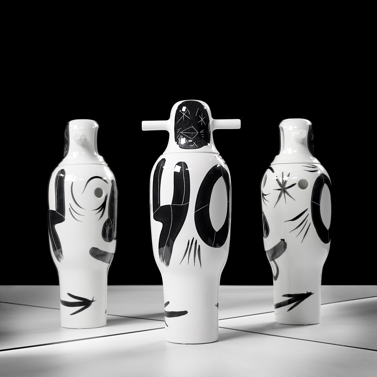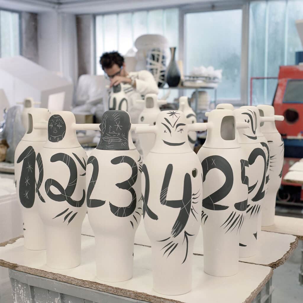 “He proposed to do a hand-painted vase using a piece from the Showtime collection, hand-painted with 40 different designs.” Jaime Hayon painted each of the white porcelain vases with black enamel, incorporating a number from one to 40 into each design.