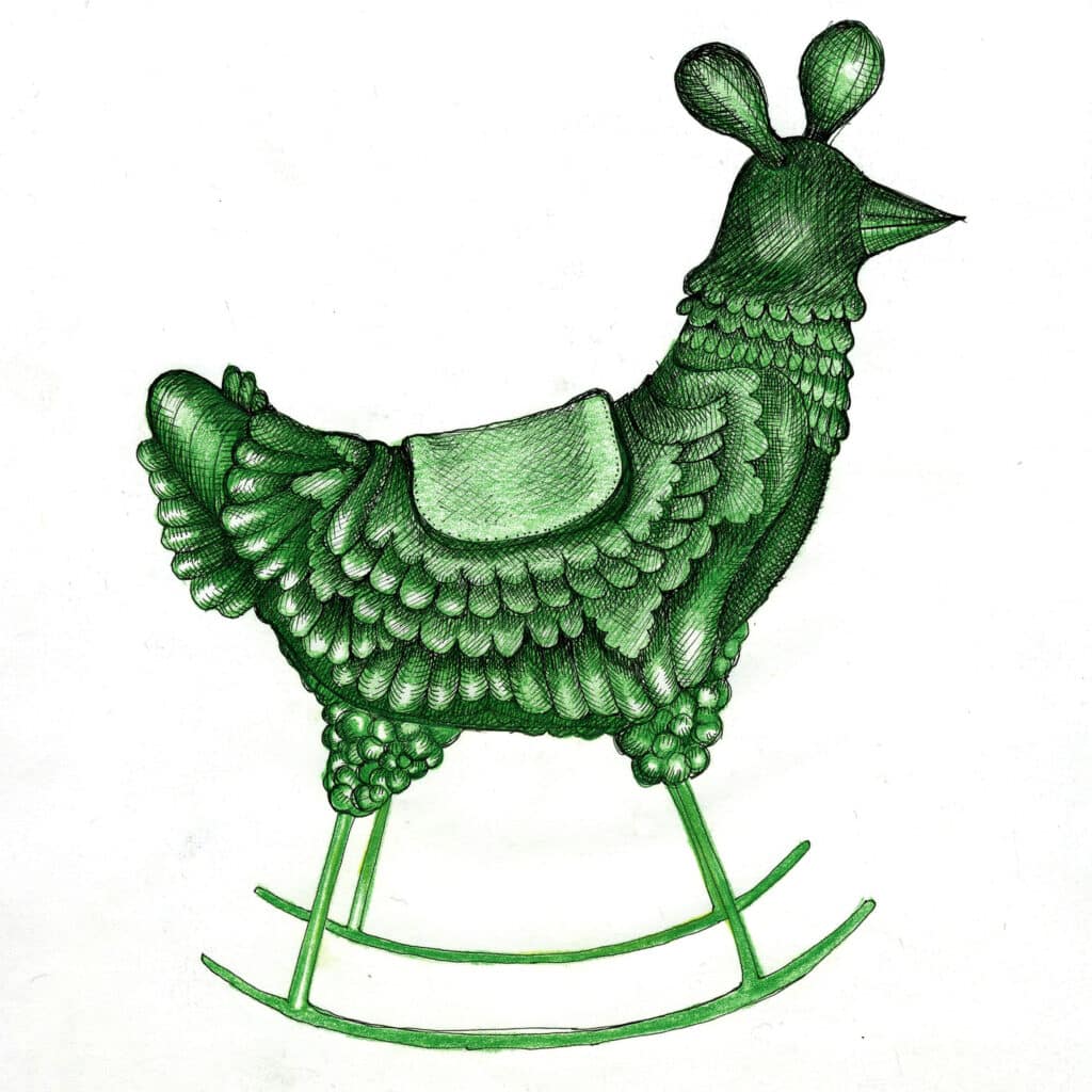 “The chicken, a rather unexplored shape, found its place amongst my green dreams. I wanted to portray this common bird as a sensational object by amplifying its characteristics and dimensions, turning it into a modern piece, one of great beauty and utility: a rocking chair.