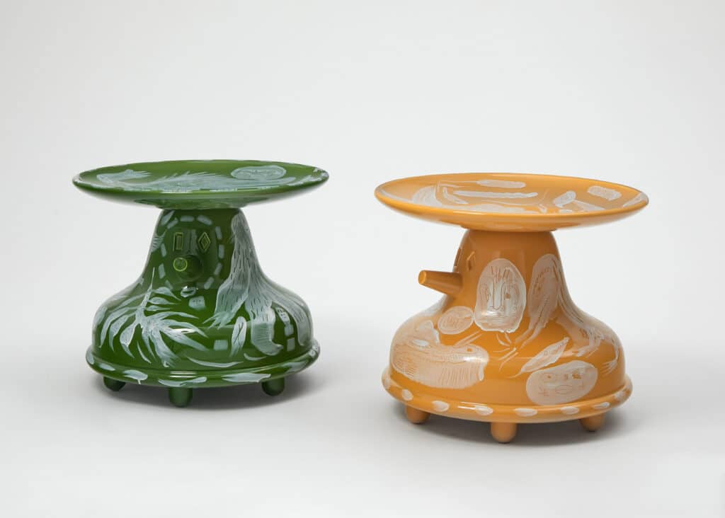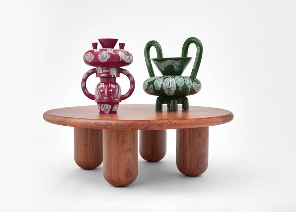 Atelier Wonderland includes bold Mediterranean-inspired vases and lamps, examples of Hayon’s experiments with monochromatic finishes. By using a mix of glaze and alcohol on his ceramics, Hayon achieves a texture reminiscent of oil paintings, giving each piece a distinct appearance. These hand-painted pieces are evocative of Hayon’s singular cosmos, where faces, abstract shapes, and celestial bodies interact. Each piece, meticulously handcrafted and painted, aligns with Hayon’s approach to creativity, bridging diverse mediums in a relentless exploration of form and narrative.