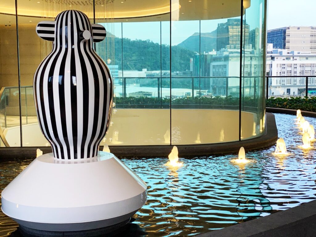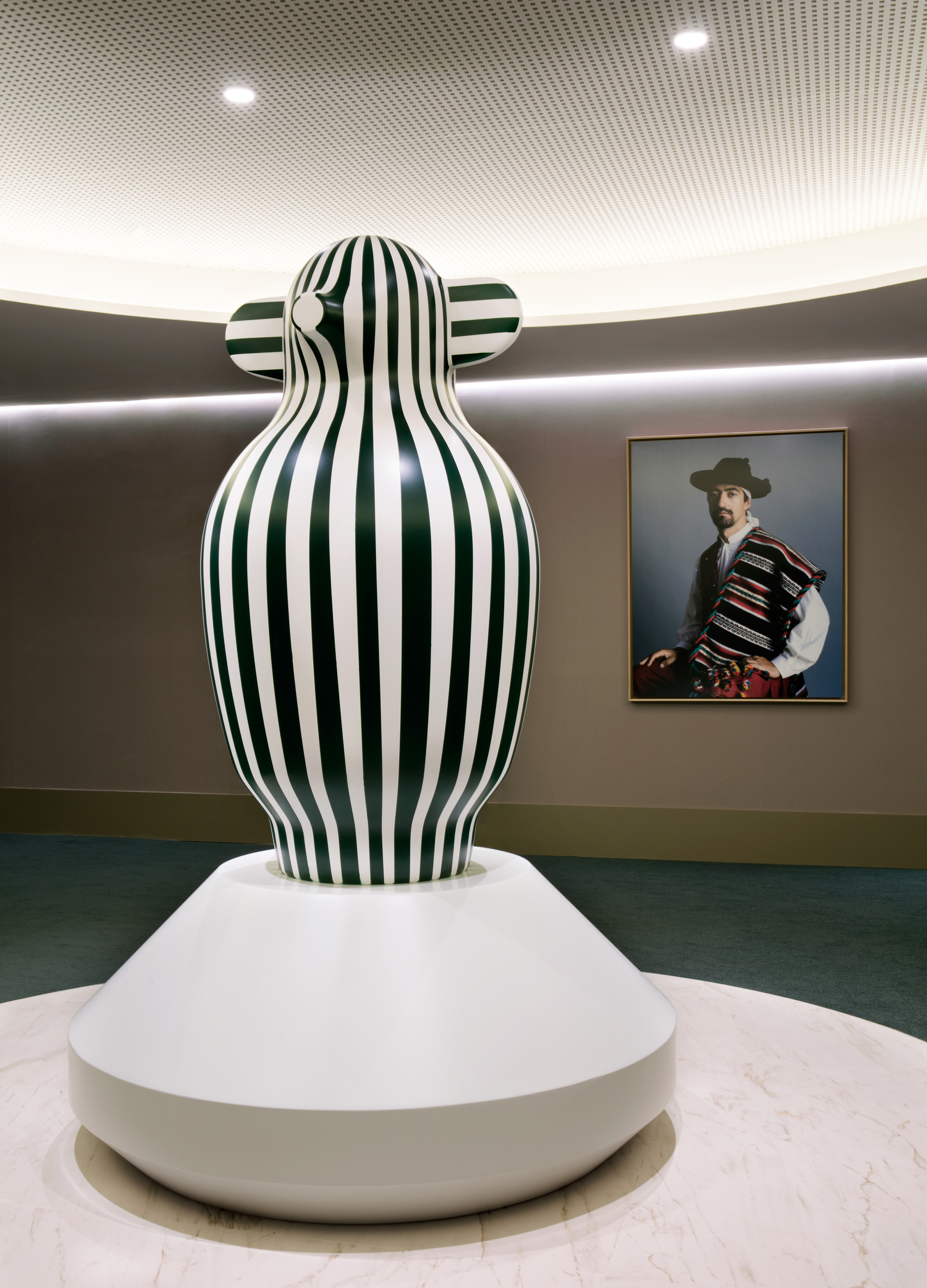 “Mon Cirque Linear” is a striking sculpture featuring a black and white striped, vase-like form resting on a wide, tapering white base. Its design is playfully whimsical, with two ear-like protrusions at the top and a single, circular opening that resembles an eye. The vertical stripes enhance the sense of height, while the bold, graphic pattern and unique form make the sculpture a captivating focal point in any setting.