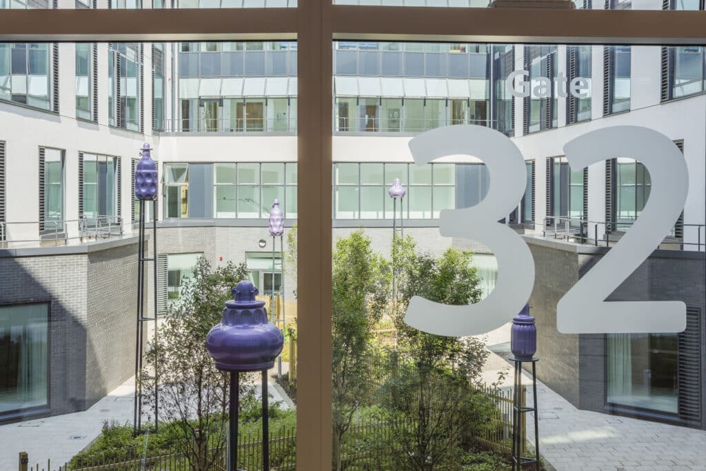 Each courtyard’s sculptures are finished in a different color, which not only distinguishes the spaces but also serves as a key part of the hospital’s wayfinding scheme. These striking installations are visible from numerous vantage points throughout the new and historic Brunel buildings.