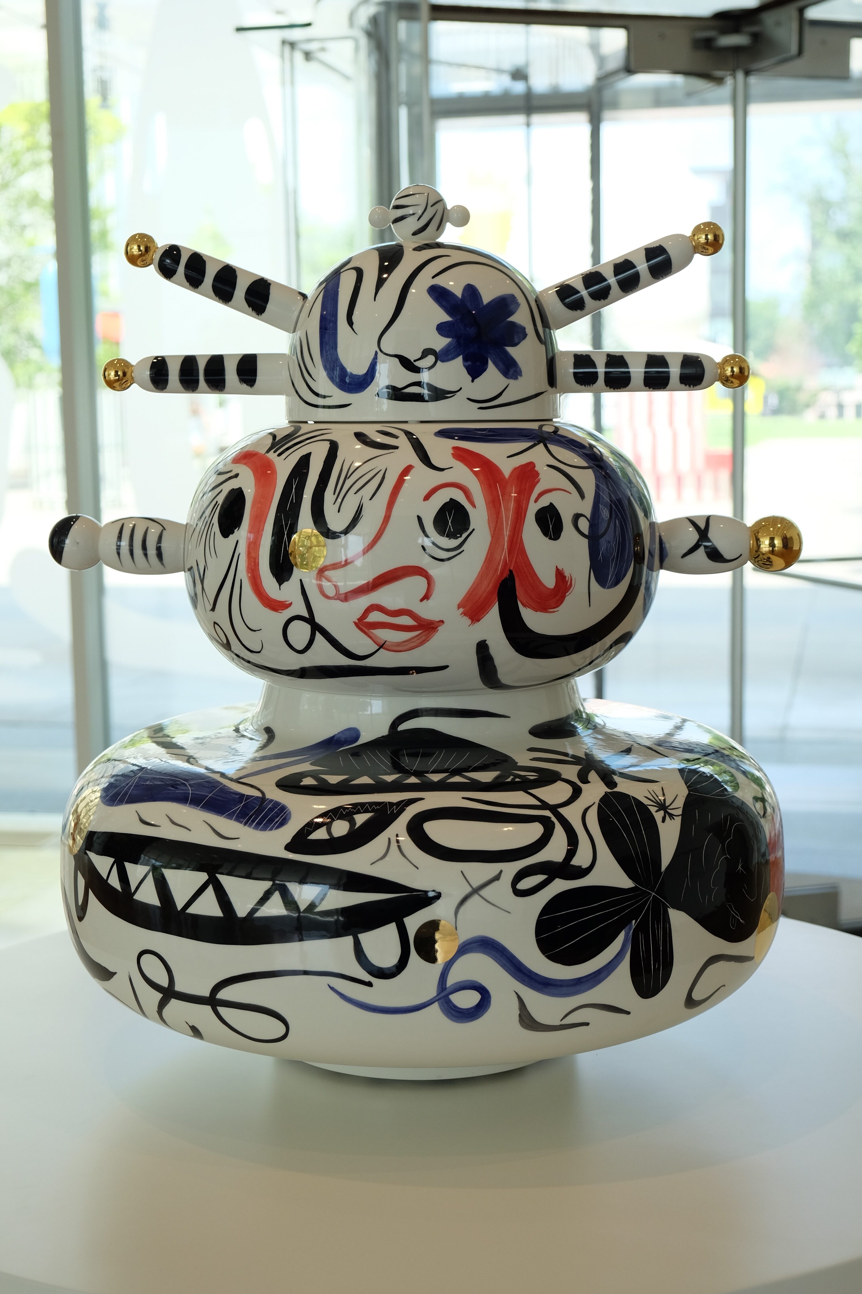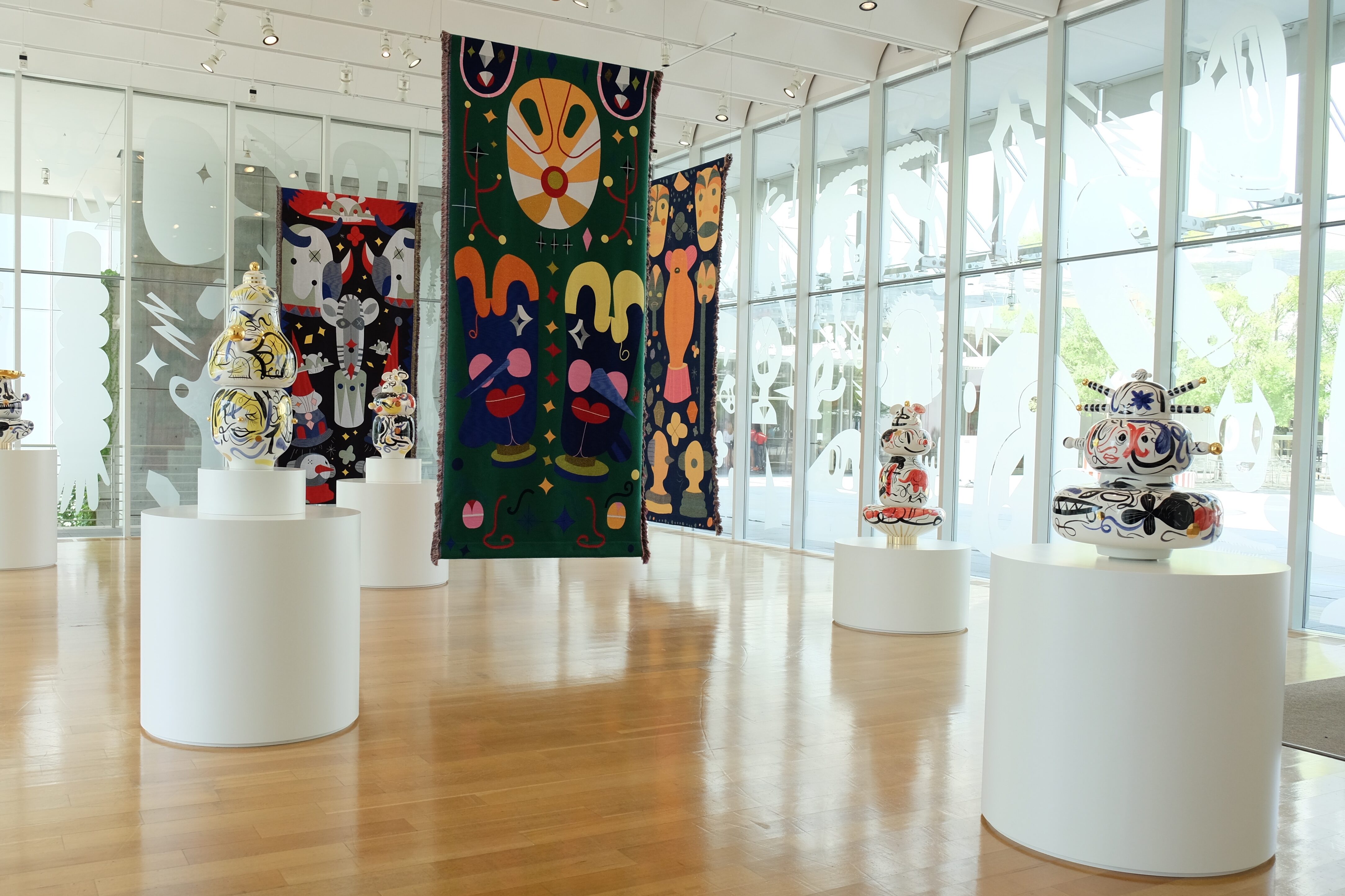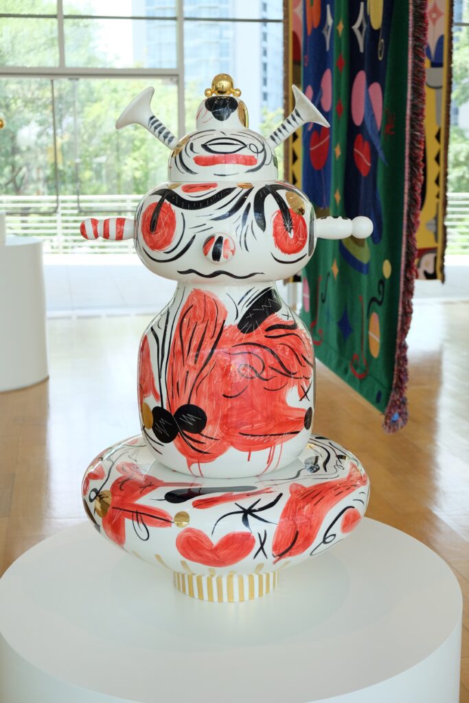 Hayon worked with the renowned Tilburg Textile Museum’s Textiel Lab in the Netherlands to weave the vibrant works using a mix of traditional fibers and non-traditional materials, such as rubber. Pedestals on the floor display quirky, stacked ceramics with colorful, expressive designs Hayon hand-painted with colored glazes. All of these works showcase Hayon’s new explorations in color and technique.