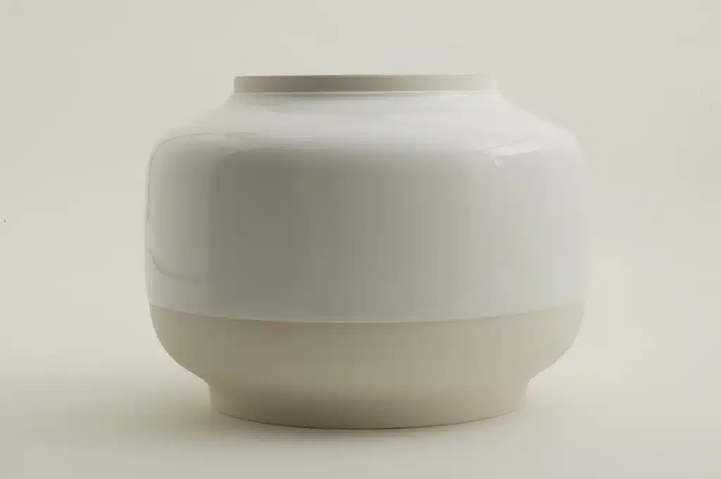 Available in two formats—as a vase (Ø 23 × H 58 cm) or as a pouf (Ø 54 × H 40 cm)—the collection includes full-size samples in all available colors, contrasting the ceramic base with the tactile warmth of leather. It represents a playful yet sophisticated design that reinterprets everyday furniture with an artistic twist.