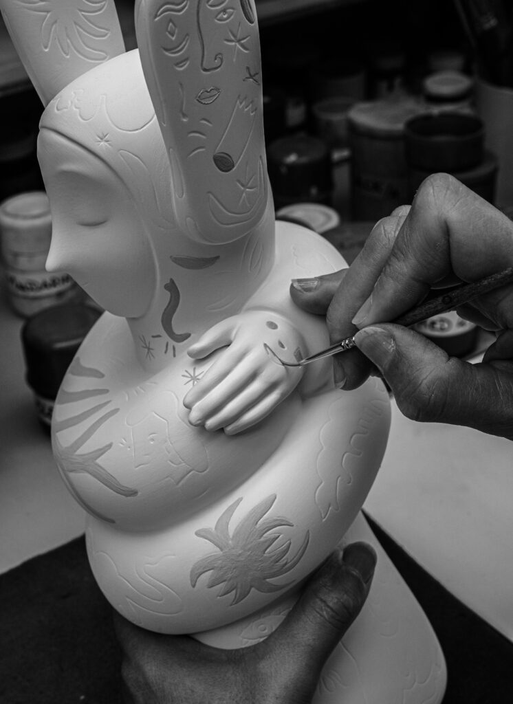 With Embraced, we explore the idea of self-care and emotional balance through form and gesture. The piece depicts a character gently hugging itself — a universal symbol of self-love and acceptance. Crafted in matte porcelain with delicate color accents and metallic touches, it reflects our ongoing dialogue between design, emotion, and craftsmanship. Every curve and expression is conceived to convey calmness and connection, turning a simple gesture into a meaningful sculpture.