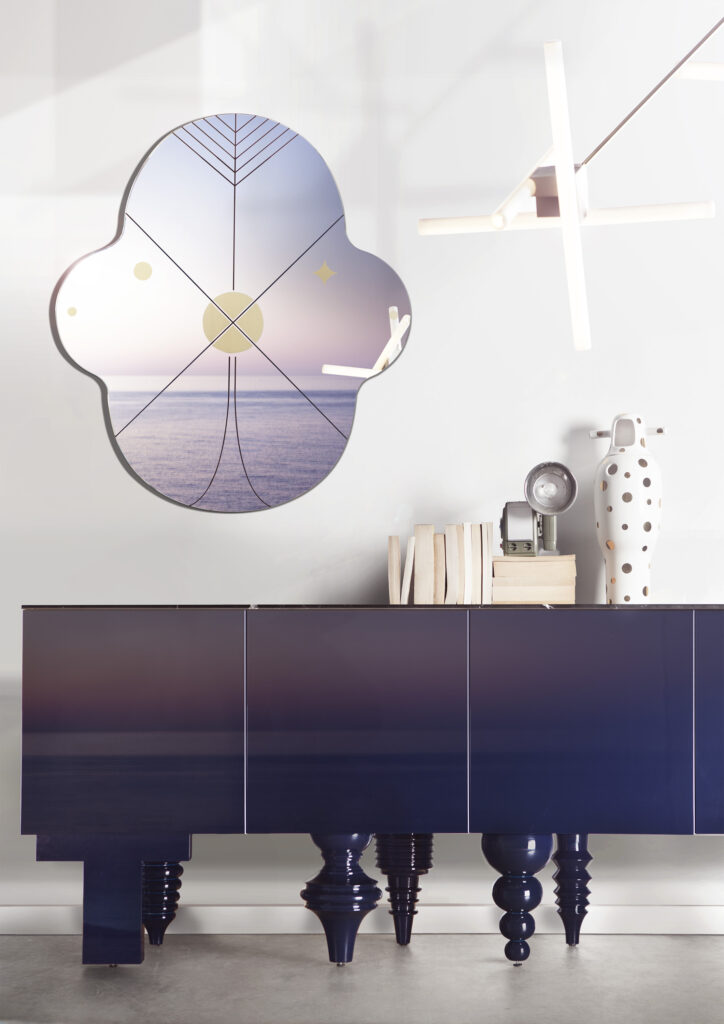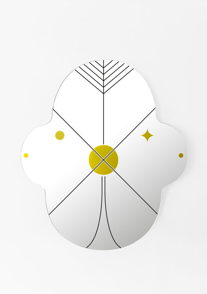 Across the mirrored surface, symmetrical geometric patterns created by black and gold lines add a touch of sophisticated, graphic artistry. This striking combination of color and pattern gives the collection a playful yet luxurious feel.