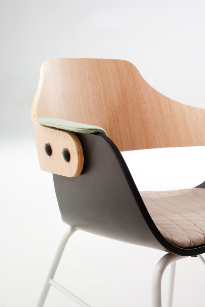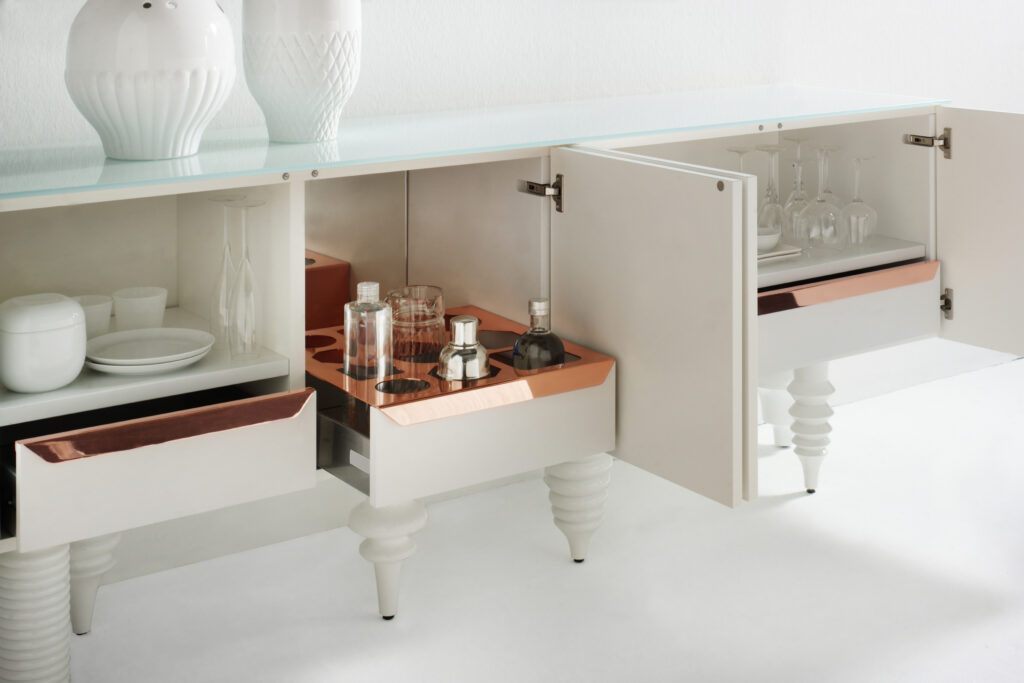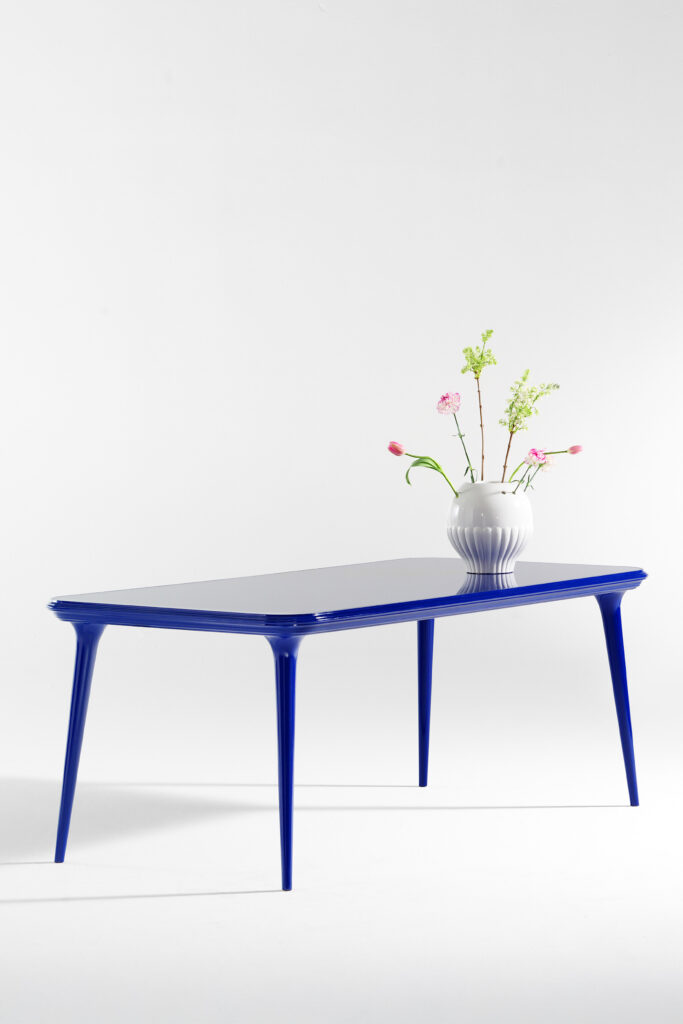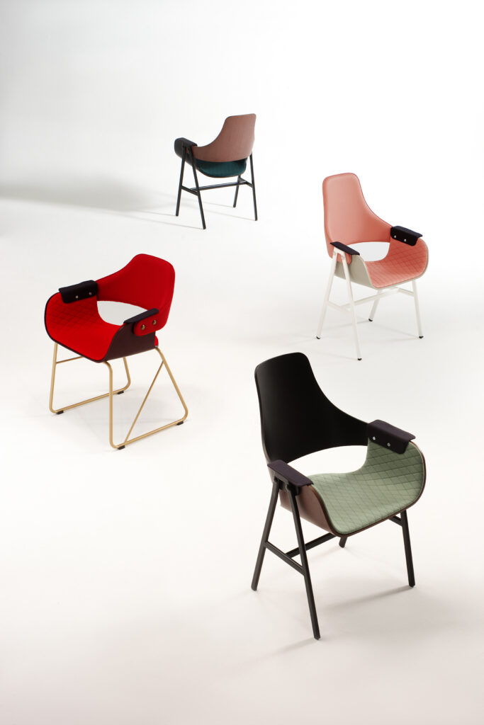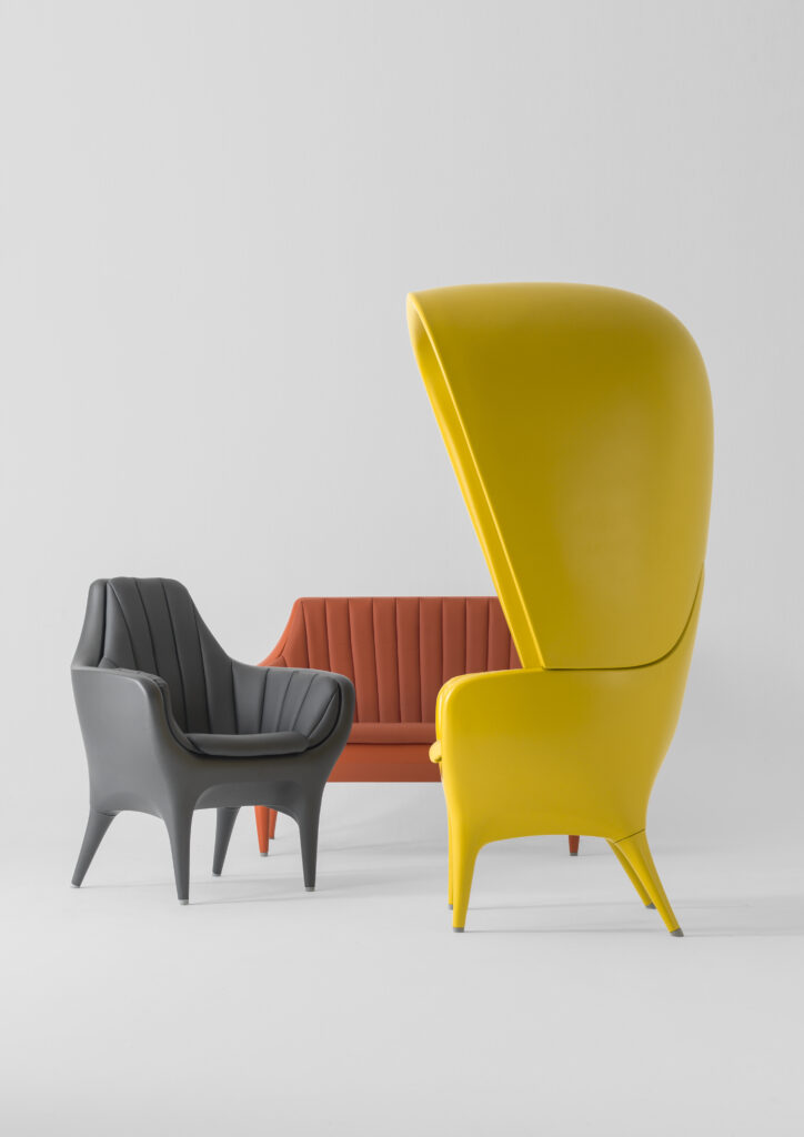 The material selection reinforces this contrast, pairing what are often considered cold or impersonal materials with warm ones. For example, roto-molded plastic for the chair’s outer part is set against a warm, leather-like capitoné (tufted) finish for the inner section. This innovative palette combines the natural, like wood, with high-tech processes such as roto-molding and semi-elaborated ceramic techniques that result in high-gloss, colorful finishes, making it a very “different” collection. The designs draw inspiration from varied sources, including old 1960s ads, with a major influence being a piece of old wicker furniture Hayon saw in a painting by the 17th-century Flemish artist Jacob Jordaens, which inspired the shape of the collection’s first item.