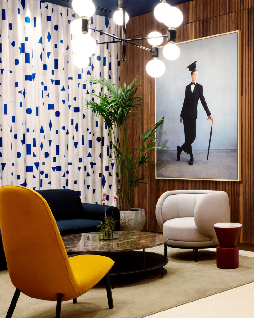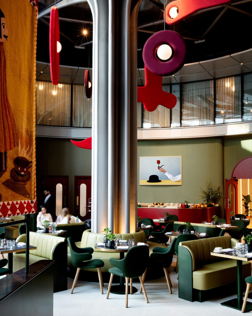 The hotel’s ground floor restaurant, Tozi Grand Cafe, is a dazzling circular room conceived as a theatrical space that operates as the hotel’s art gallery: here, a series of beautiful custom-made Hayon tapestries made in the Netherlands from recycled yarn hang in the air to punctuate the space.