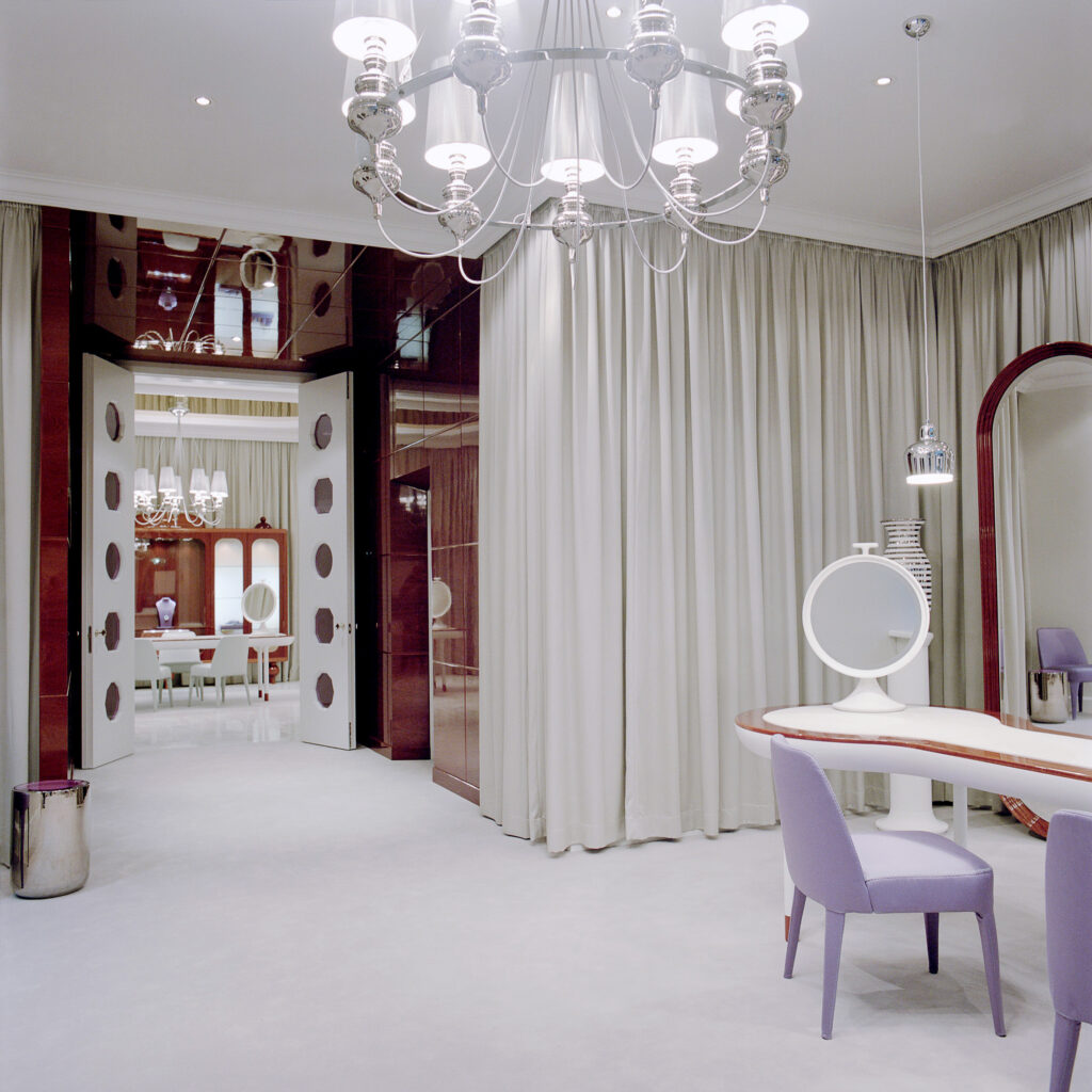The concept and design for the Fabergé boutique has been created by renowned Spanish artist-designer Jaime Hayon, whose own artistic aesthetic, entirely in tune with the spirit of Fabergé, focuses on superlative craftsmanship, sensually minimal shapes and forms, and exquisite materials, including silk wall drapes, rare woods and Carrara marble. All materials are natural giving the boutique an organic and dynamic feel, enticing and enveloping its high energy, balanced by a serenity that comes from the tonality of neutral, silvered metallic shades. Katharina Flohr, Creative Director of Fabergé, chose Hayon, she says, for his intuitive blend of “historical grandeur and freshness, his balance between opulence and modernity.” The sensitivity, the respect for materials, the attention to detail, the element of desire, that all characterise contemporary Fabergé jewellery are carried through into the boutique environment.
