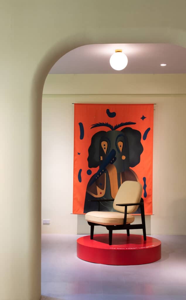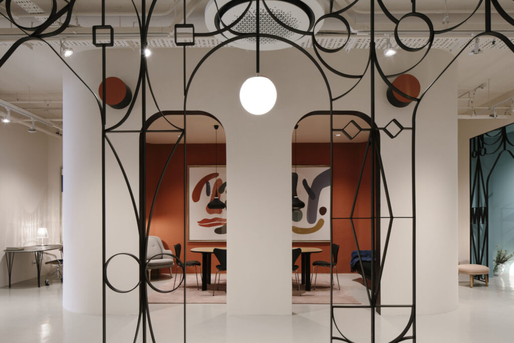 The spaces created for Fritz Hansen showcase the brand’s iconic nordic furniture, with interior designs shaped by long-time collaborator Jaime Hayon. The Bangkok showroom, a renovated 1950s residence, features a landscape inspired by the curves of classic Fritz Hansen pieces, with a playful rabbit sculpture by Hayon welcoming visitors. Its interior blends retro-futurism with pastel colors, highlighting furniture and abstract paintings created by Hayon. The Singapore lounge, meanwhile, uses intricate metal structures to create cozy, distinct spaces within an industrial building, combining pale terrazzo and light walls with bursts of color and natural wood to showcase the full range of Fritz Hansen’s collections.