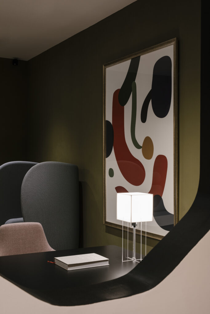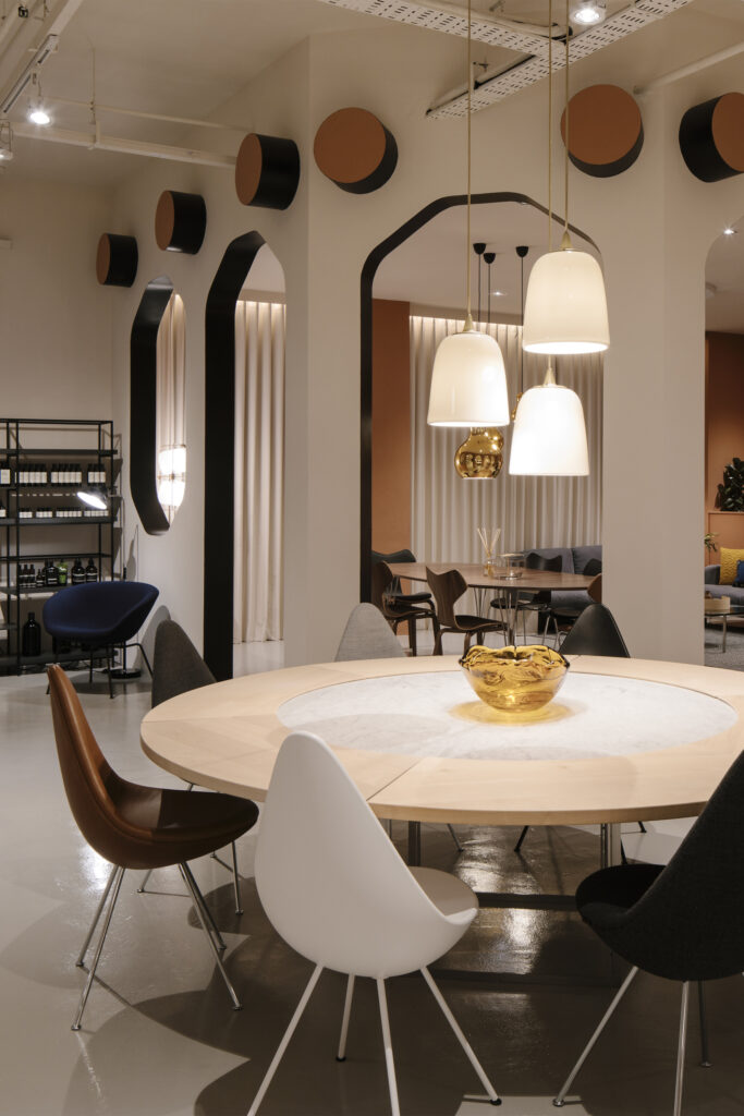 Intricate structures crafted in metal with whimsical patterns help create individual, cozy spaces while letting the environment breathe. These discreet capsules create scenes that can serve as an inspiration to interior designers, with custom-made elements and architectural components. A calm and elegant environment is achieved with the combination of pale terrazzo and light walls mixed with pops of colour and natural wood. Together with the soft textiles in curtains and carpets, the store’s interior nicely contrasts with industrial building in which it is housed.