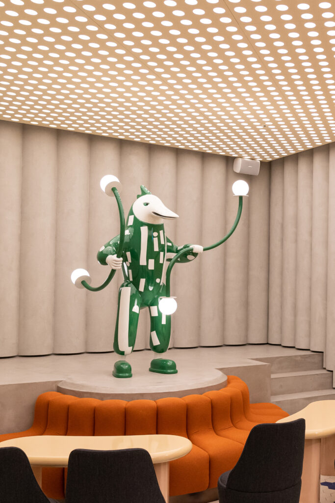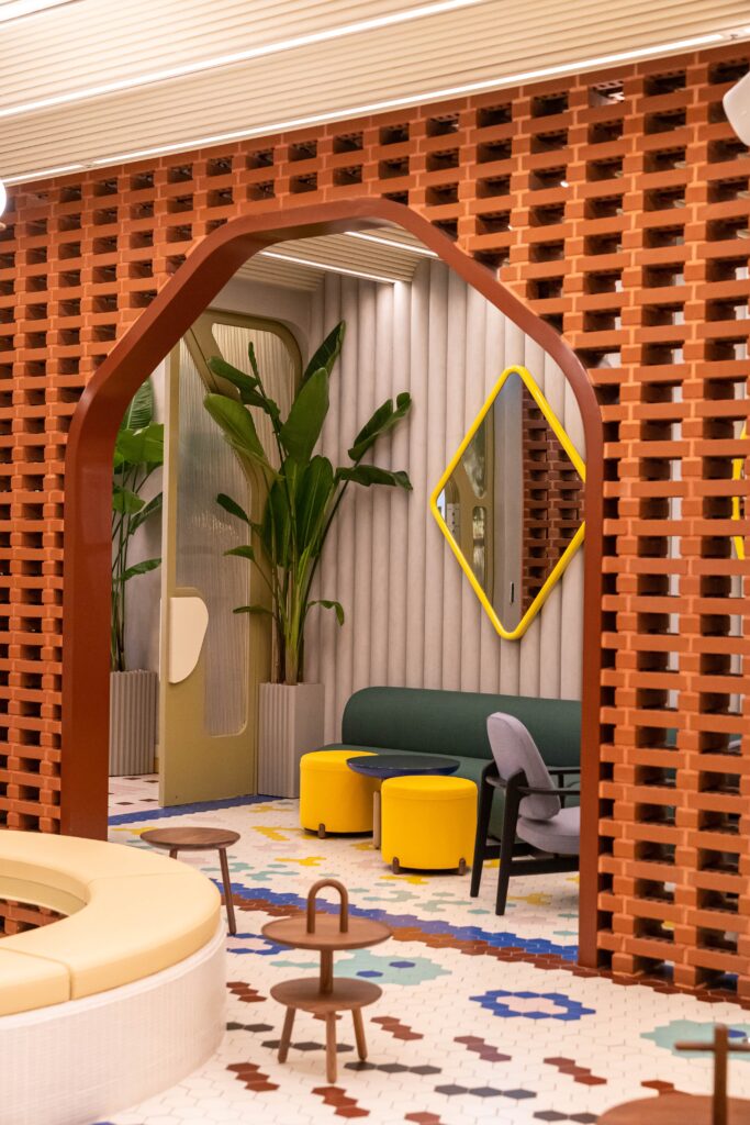 The Pangyo lounge exemplifies this philosophy by seamlessly blending cutting-edge technology with time-honored traditions. It showcases a dynamic interplay of materials, where classic bricks meet sleek metallic surfaces adorned with intricate patterns and vibrant colors. Traditional elements like ceramics are thoughtfully integrated with contemporary sculptures crafted from fiber, creating a harmonious dialogue between old and new.